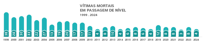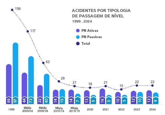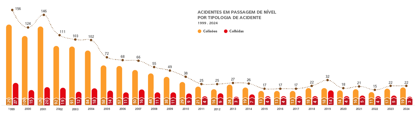 O desenvolvimento de estratégias adequadas, inicialmente focadas na redução massiva do número de passagens de nível existentes e, numa fase posterior, apostando na supressão e automatização das de maior risco, medida complementada por campanhas de sensibilização e educação para os riscos a ter no atravessamento das PN, levou a uma redução significativa da sinistralidade: -81% nos últimos 20 anos.
